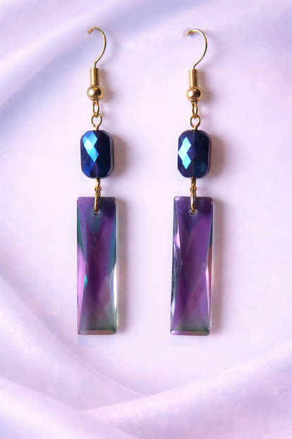 Deze unieke oorbellen combineren een schitterende facetkraal in iriserend paars-blauw met een elegante, langwerpige hanger die subtiel van kleur verandert in het licht. Het resultaat is een speels maar stijlvol accessoire dat elke outfit een luxueuze touch geeft.