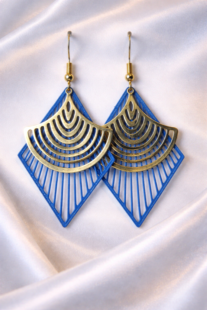 De Blauwe Zonnestraal Statement Oorbellen zijn gemaakt voor iedereen die houdt van kleur, lef en een moderne look. Het ontwerp bestaat uit een felblauwe geometrische basis die doet denken aan zonnestralen, gecombineerd met een goudkleurig bovenmotief van strakke, oplopende bogen. Deze twee lagen creëren samen een dynamisch en stijlvol geheel dat meteen in het oog springt.