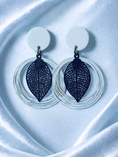 De Blauw Briesblaadje Oorbellen hebben een frisse, luchtige uitstraling die meteen doet denken aan een zachte zomerbries. Bovenaan zit een helderwitte stud die het geheel een strakke, moderne toets geeft. Daaronder wiegt een fijne, zilverkleurige cirkel mee bij elke beweging. In het midden hangt een prachtig donkerblauw bladmotief, sierlijk opengewerkt alsof het rechtstreeks uit de natuur komt.