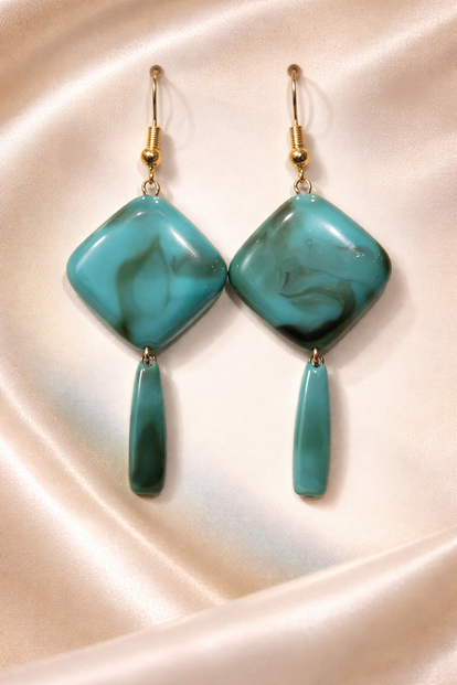 Breng kleur en elegantie in je look met deze Turquoise Wave Drop Oorbellen. Het vierkante marmerlook element in warme turquoise tinten loopt subtiel door in een slanke, organische hanger — samen creëren ze een speels maar stijlvol silhouet.