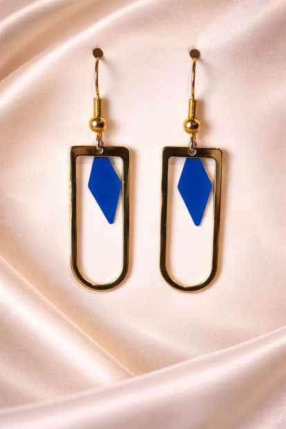 De Blue Geometric Frame Oorbellen zijn perfect voor iedereen die houdt van strakke lijnen, moderne vormen en een subtiel kleuraccent. Het ontwerp bestaat uit een gouden rechthoekig frame met afgeronde onderkant, waarbinnen een felblauwe geometrische hanger elegant meebeweegt. De combinatie van goud en helderblauw zorgt voor een frisse, stijlvolle look die moeiteloos opvalt.