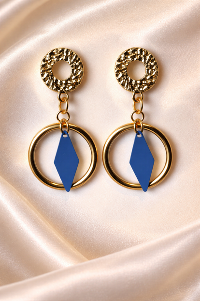 De Gouden Ring & Royal Drop Oorbellen combineren elegantie met een speelse, moderne twist. Het ontwerp start met een goudkleurige, textuur-rijke stud die prachtig het licht vangt. Daaraan hangt een glanzende gouden ring, subtiel aangevuld met een felblauwe ruitvormige hanger die zorgt voor een frisse kleuraccent.