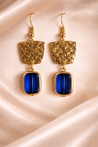 Stijlvolle oorbellen met een subtiel gouden trapeziumvormig tussenstuk en een prachtig blauw steentje met gouden rand. Een elegant en modern sieraad dat elke outfit een verfijnd accent geeft.