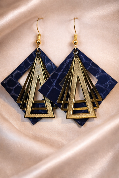 De Driehoekskes Deluxe zijn oorbellen die meteen laten zien dat je durft te stralen. Met hun opvallende geometrische lagen — een donkerblauwe vierkante basis in crocoprint én gouden driehoekjes die speels over elkaar vallen — vormen ze een perfecte mix van stoer, chic en modern.
