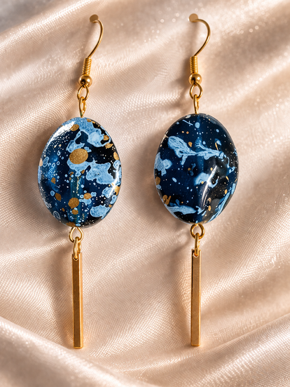 Deze handgemaakte oorbellen combineren zachte marmerlook tinten met een elegante, matte goudkleurige hanger. De bovenste kraal heeft een warm patroon in crème- en karameltonen, terwijl de ovale onderhanger zorgt voor een rustige, luxe uitstraling.