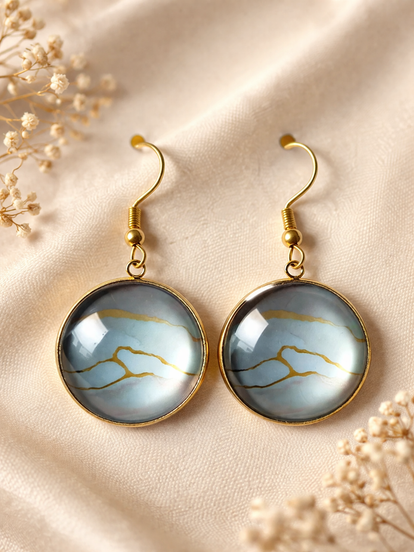 Deze handgemaakte oorbellen hebben een rustige, verfijnde uitstraling. De ronde cabochon toont een zachte grijsblauwe marmerlook met subtiele goudkleurige aders, wat zorgt voor een elegante en luxe uitstraling. Elk paar is uniek door het natuurlijke patroon in de cabochon.
