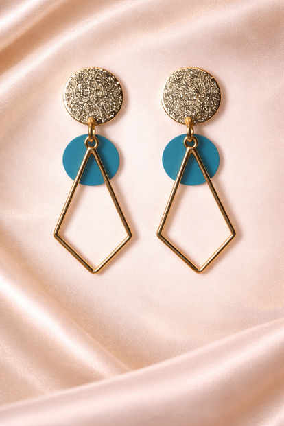 De Gouden Diamant & Ocean Drop Oorbellen brengen frisse kleuren en moderne vormen samen in één stijlvol ontwerp. De oorbel begint met een sprankelend, goudkleurig studje met een subtiele textuur. Daaronder hangt een turquoise rond schijfje dat zorgt voor een vrolijke kleurboost. De lange, opengewerkte diamantvorm in goud maakt het geheel luchtig, verfijnd en chic.