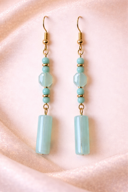 Deze elegante oorbellen combineren meerdere turquoise tinten in een speelse, verticale opstelling. Facetkralen vangen subtiel het licht, terwijl de langwerpige glassteen onderaan zorgt voor een sierlijke, vloeiende beweging.