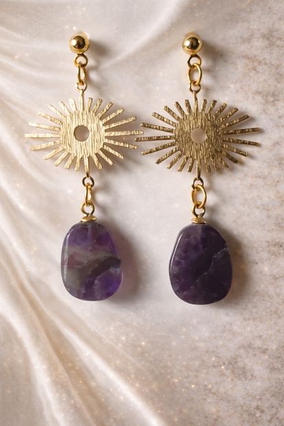 Deze elegante oorbellen combineren een goudkleurig zonmotief met een diep paarse natuursteen. Het stralende ontwerp geeft de oorbellen een krachtige en luxe uitstraling, terwijl de steen zorgt voor een zachte, natuurlijke balans. De subtiele textuur in het goudkleurige element vangt het licht prachtig bij elke beweging.