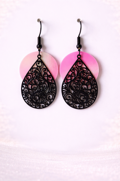 Deze handgemaakte oorbellen combineren een zachte roze achtergrond met een elegant zwart opengewerkt patroon. Het kantachtige design geeft de oorbellen een verfijnde uitstraling, terwijl de kleurcombinatie zorgt voor een moderne en speelse twist.