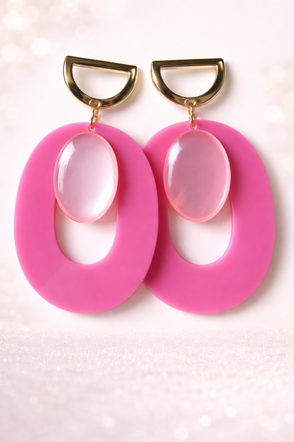 Deze statement oorbellen in roze zijn gemaakt om op te vallen. De grote ovale vorm in een krachtige roze tint wordt gecombineerd met een zacht glanzend detail en een goudkleurige bovenkant. Het contrast tussen mat en glans geeft de oorbellen een speelse maar luxe uitstraling.