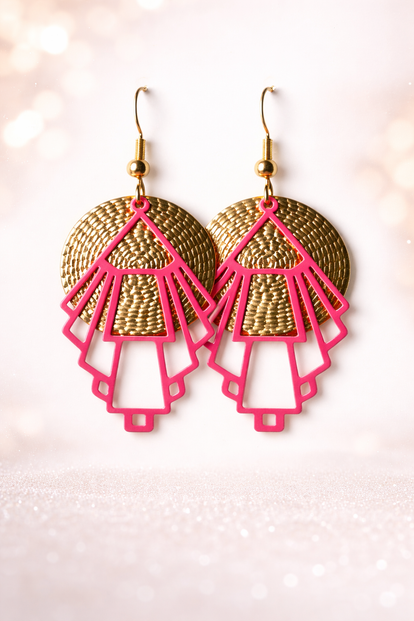 Deze handgemaakte oorbellen combineren meerdere cirkelvormen tot één speels en elegant geheel. De goudkleurige ringen en textuur zorgen voor een warme uitstraling, terwijl het roze accent een frisse, vrouwelijke touch toevoegt.