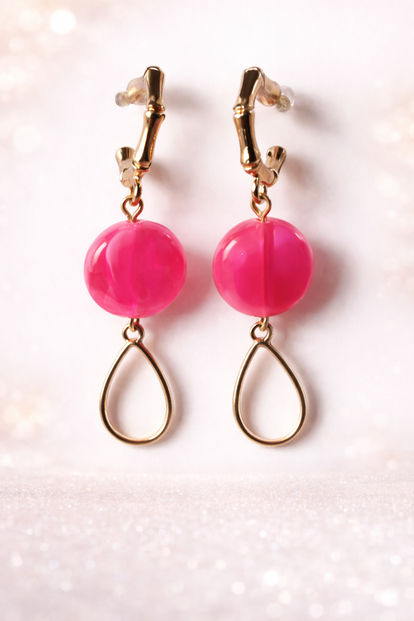 Deze oorbellen combineren een helder roze kraal met een elegante druppelvormige hanger. De goudkleurige details geven het ontwerp een luxe uitstraling, terwijl de ronde kraal zorgt voor een speelse en frisse touch. De vorm is slank en vrouwelijk, waardoor de oorbellen mooi meebewegen tijdens het dragen.