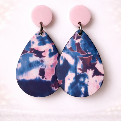 Deze trendy oorbellen hebben een zachte roze stud met daaronder een grote druppelvormige hanger in een abstract marmerpatroon van donkerblauw, roze en lila, ideaal voor een speelse maar stijlvolle uitstraling.
