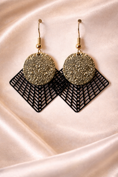 Het bovenste deel bestaat uit een strakke geometrische ruit met open midden, verbonden met een elegante zwarte filigree-hanger. De combinatie van strakke lijnen en sierlijke patronen maakt deze oorbellen perfect voor fashionista’s die houden van stijlvolle statement jewelry met karakter.