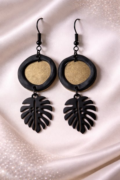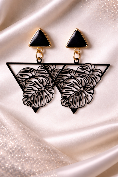 Deze lichtgewicht statement pieces combineren een opengewerkt geometrisch bloemmotief met een strakke bladvorm, waardoor ze zowel speels als stijlvol zijn. Het contrast tussen het zwarte honingraatdesign en het metallic bladframe maakt deze oorbellen een echte blikvanger — perfect voor wie houdt van kunstzinnige, eigentijdse sieraden.