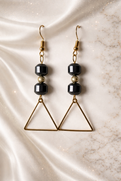 Deze handgemaakte oorbellen combineren strakke geometrische vormen met een elegante kleurcombinatie. De oorbellen bestaan uit glanzende zwarte kralen, een subtiele goudkleurige accentkraal en een open driehoek hanger die zorgt voor een moderne, grafische look.