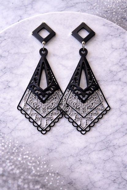Deze Black Geometric Lacework Statement Earrings combineren moderne vormen met verfijnde details. De oorbellen bestaan uit een opengewerkte diamanten hanger, opgebouwd uit meerdere lagen met een subtiel kantachtig filigree-design. Hierdoor ontstaat een luchtig maar opvallend silhouet dat prachtig beweegt bij elke stap.