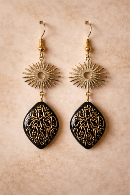 Daaronder hangt een elegante zwarte druppelvormige hanger met een verfijnd goudkleurig patroon. Het contrast tussen het mat-metalen zonnetje en de glanzende decoratieve hanger zorgt voor een luxe effect dat in elke outfit opvalt.