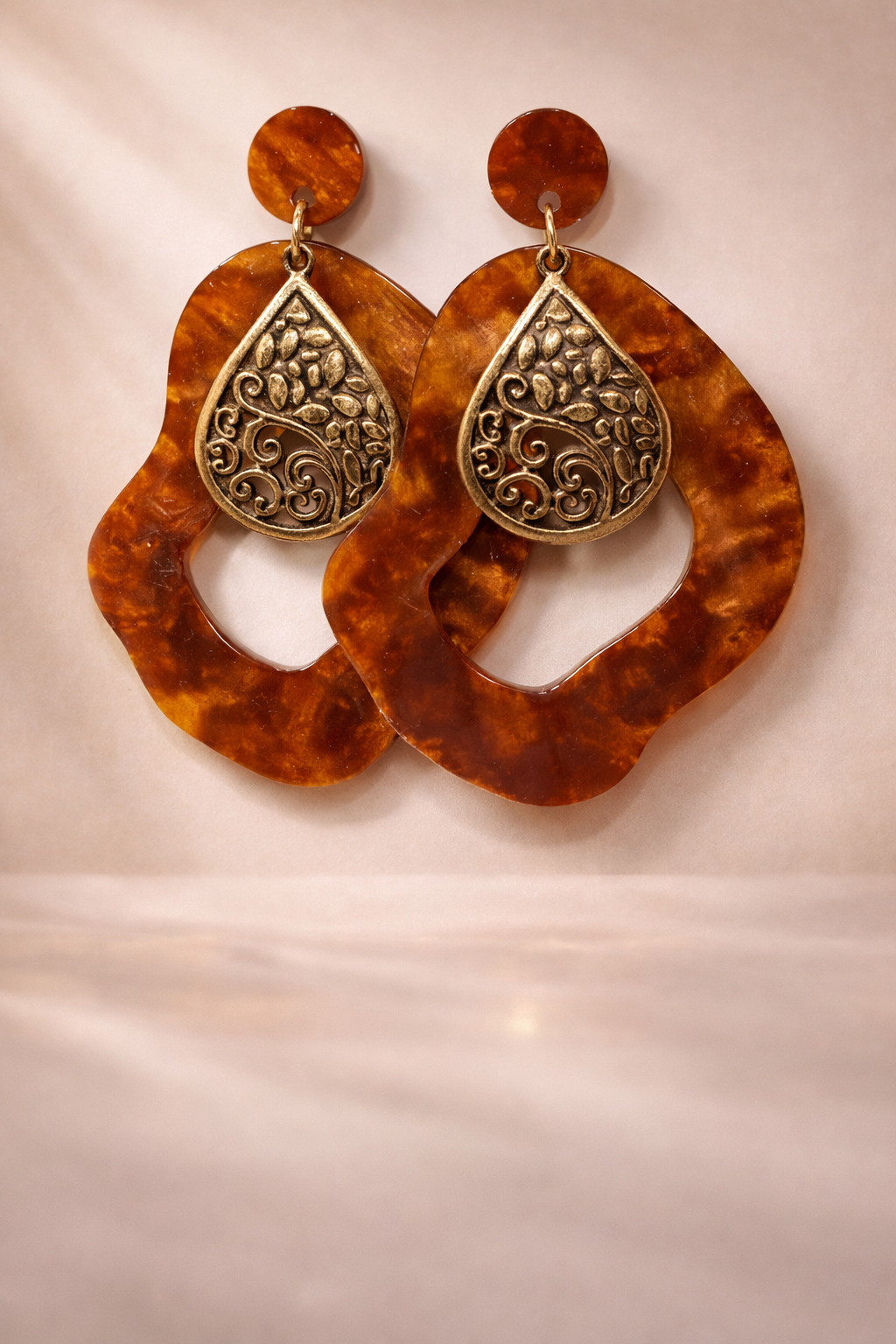 Geef je outfit een warme, stijlvolle uitstraling met deze Amber Wave Statement Oorbellen. De organisch gevormde amberkleurige ring heeft een prachtige marmerlook die bij elke lichtval subtiel verandert. Het metalen druppelvormige filigraan-element voegt een vleugje vintage elegantie toe, waardoor deze oorbellen een echte blikvanger zijn.