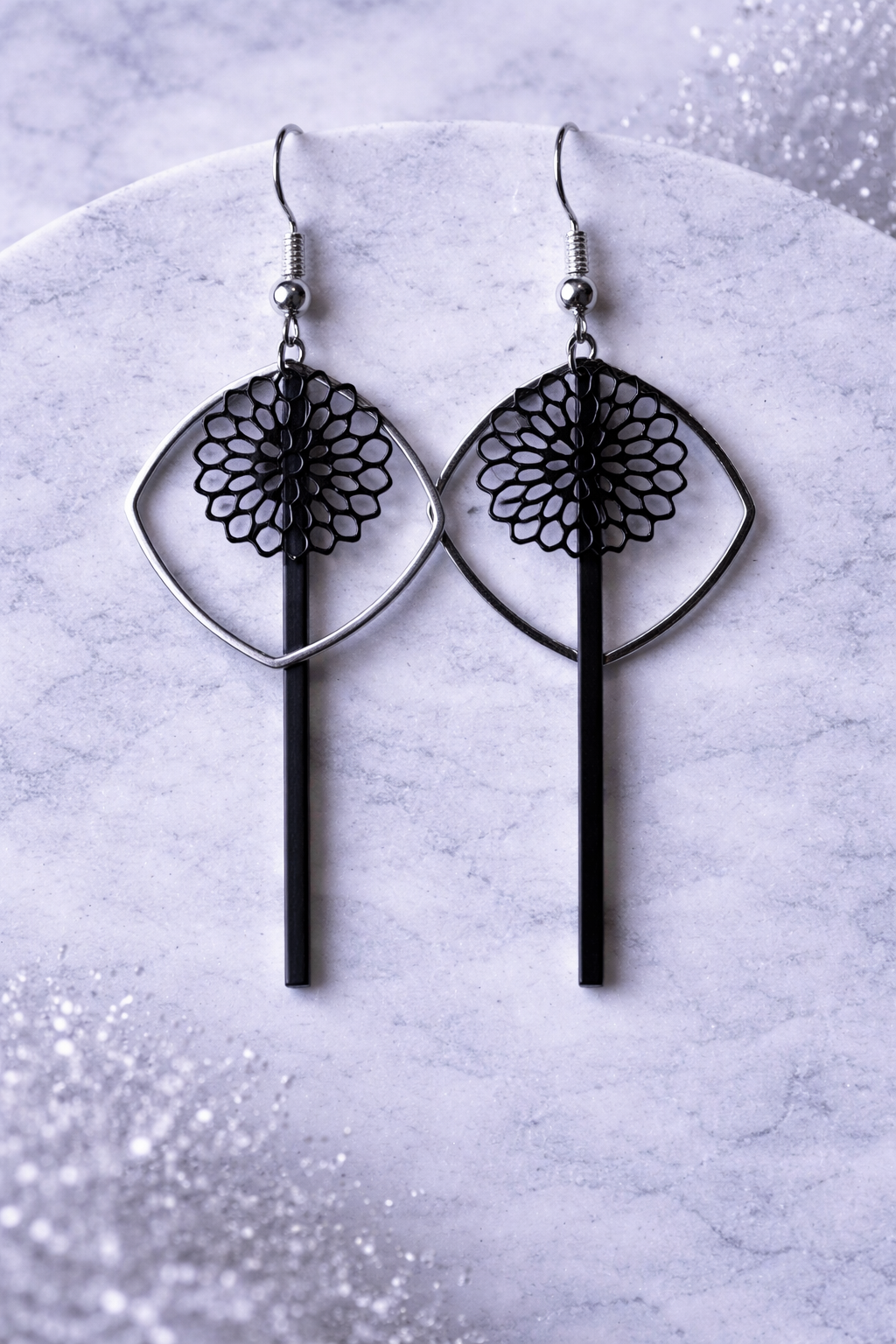 Deze lichtgewicht statement pieces combineren een opengewerkt geometrisch bloemmotief met een strakke bladvorm, waardoor ze zowel speels als stijlvol zijn. Het contrast tussen het zwarte honingraatdesign en het metallic bladframe maakt deze oorbellen een echte blikvanger — perfect voor wie houdt van kunstzinnige, eigentijdse sieraden.
