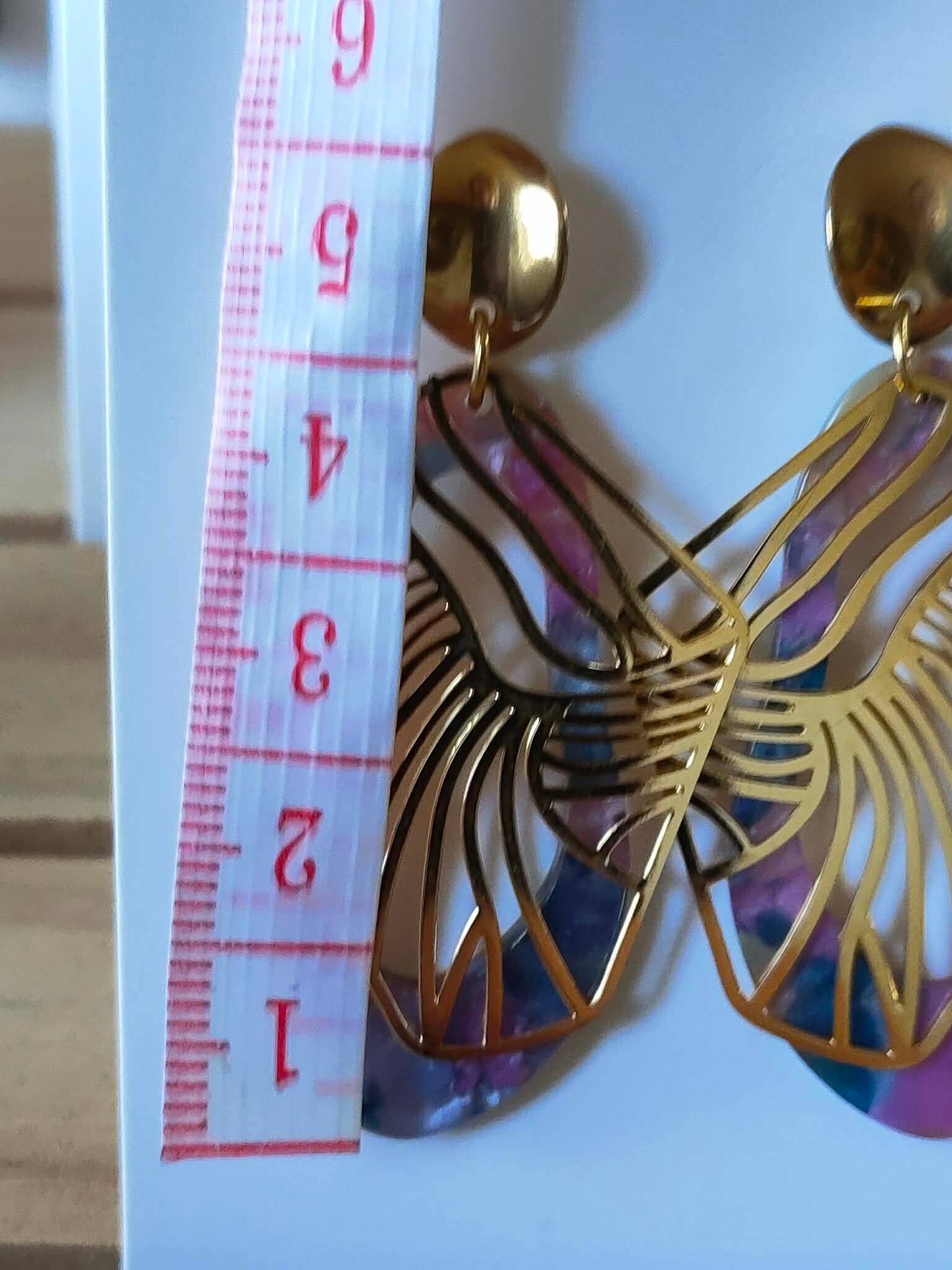 De Golden Leaf Dream oorbellen combineren elegantie met een artistiek statement. Het verfijnde gouden bladmotief zorgt voor een luxueuze uitstraling, terwijl de gemarmerde resin in paars- en blauwtinten diepte en speelsheid toevoegt.