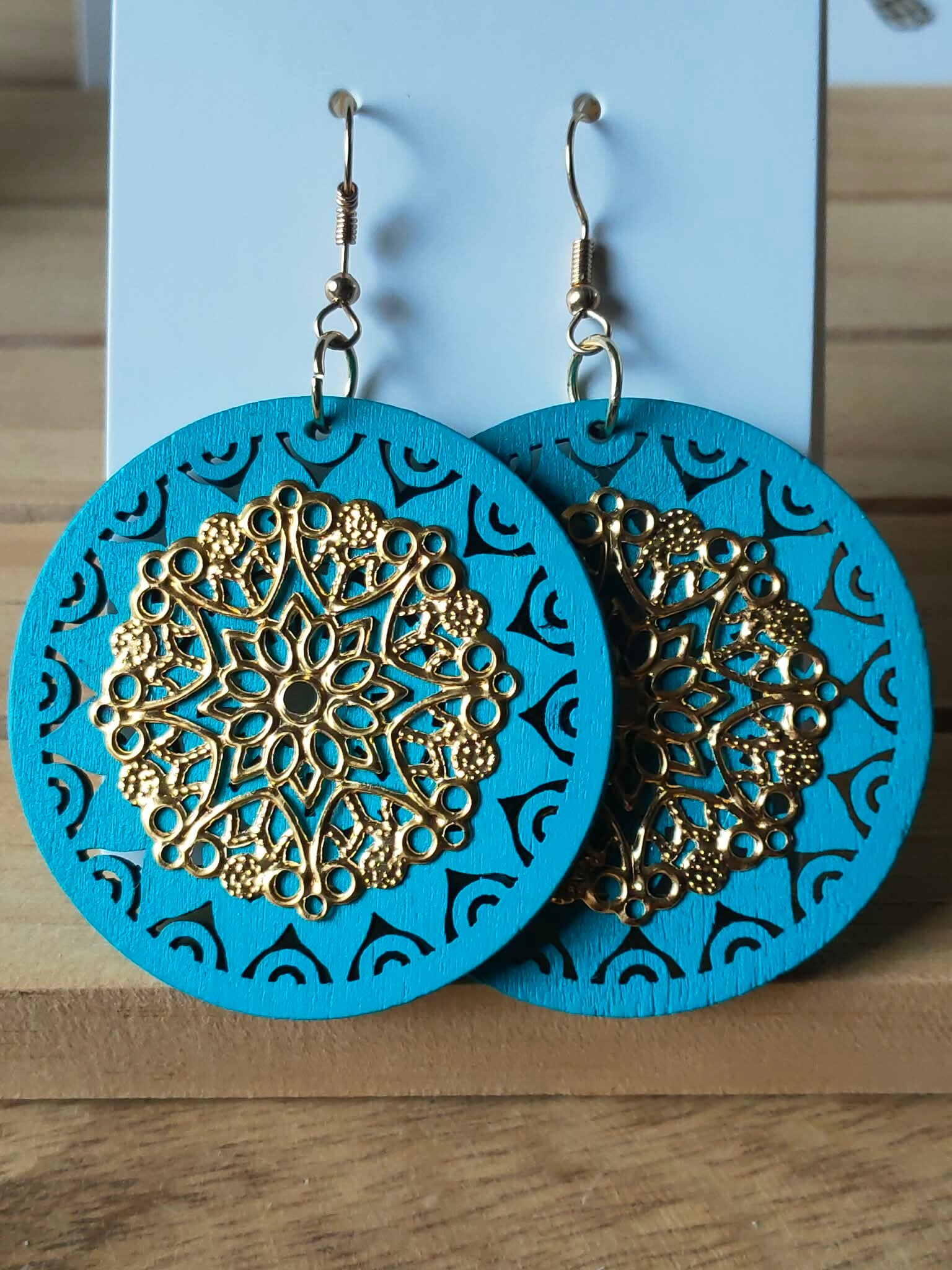 Houten Oorbellen Mandala Rond – Turquoise & Goud