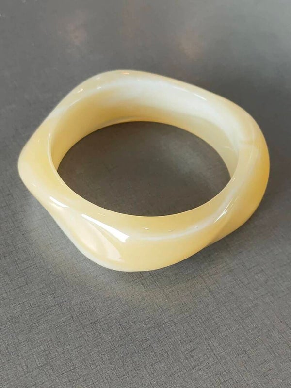 Deze handgemaakte resin armband in zachte honingkleur straalt warmte en verfijning uit. De subtiele overgangen van crème naar warm geel creëren een vloeiend, bijna wolkachtig marmerpatroon dat bij elke beweging anders tot zijn recht komt.