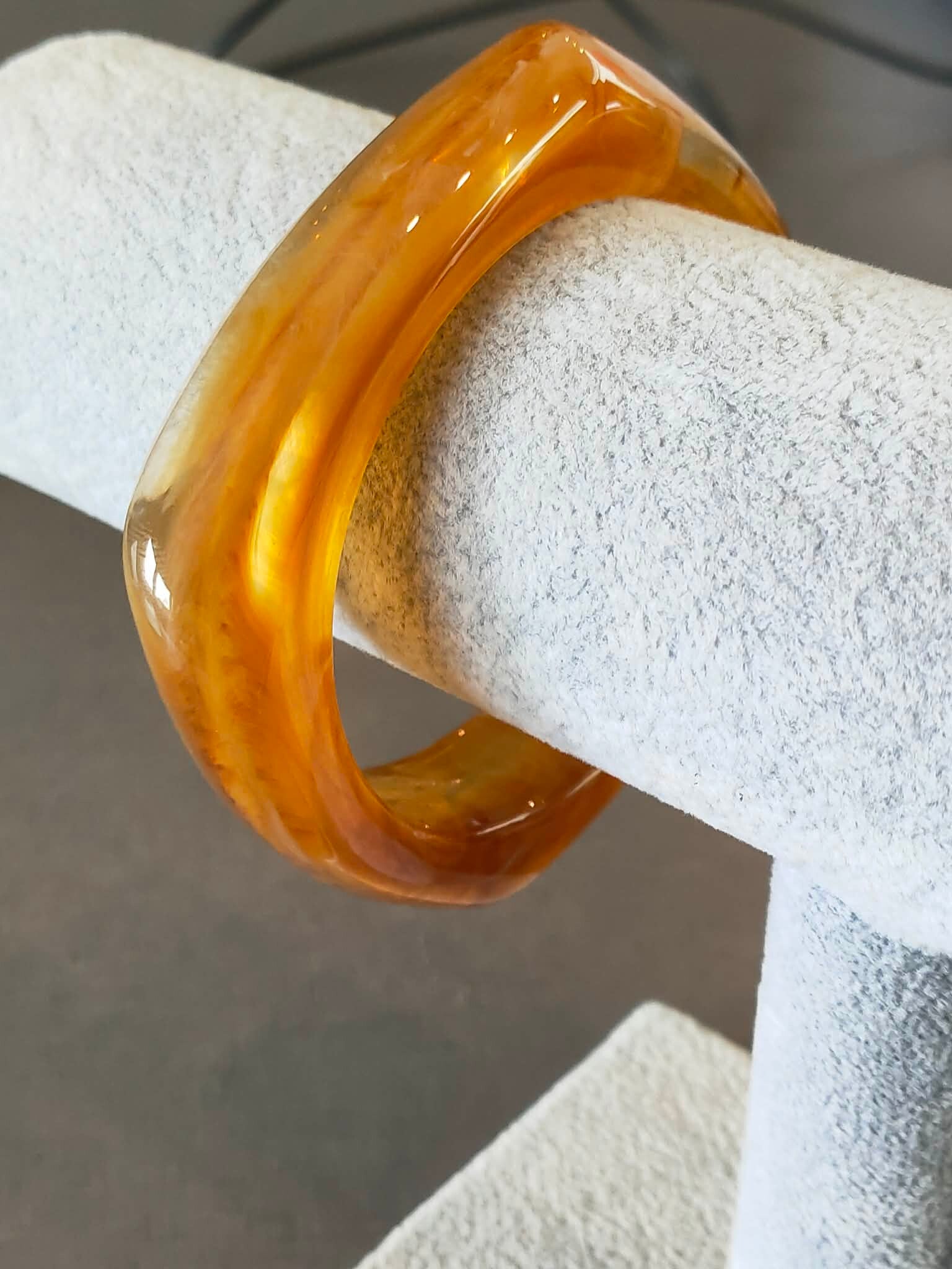 Deze resin armband in warme honing- en oranje tinten straalt energie en elegantie uit. De combinatie van zachte crème nuances en diepere amberkleurige swirls creëert een levendig gemarmerd effect met prachtige diepte.