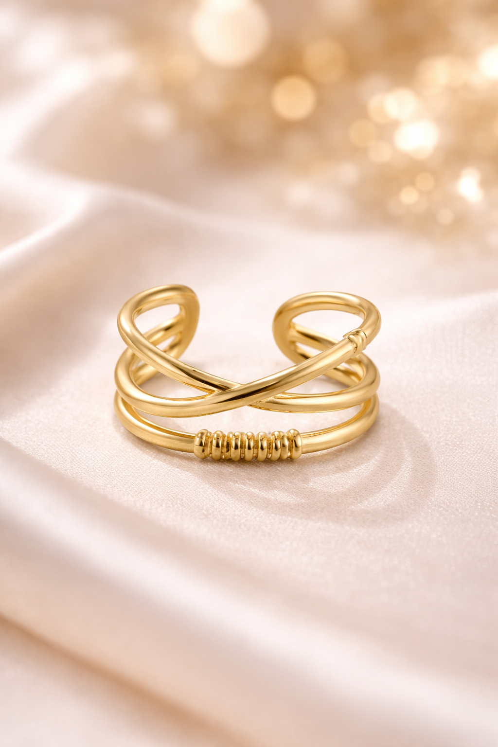 De Aurora Twist Ring combineert elegantie met een modern, gelaagd design. De sierlijke, gekruiste lijnen geven de ring een speelse maar verfijnde uitstraling, terwijl het subtiele detail in het midden zorgt voor nét dat extra accent.