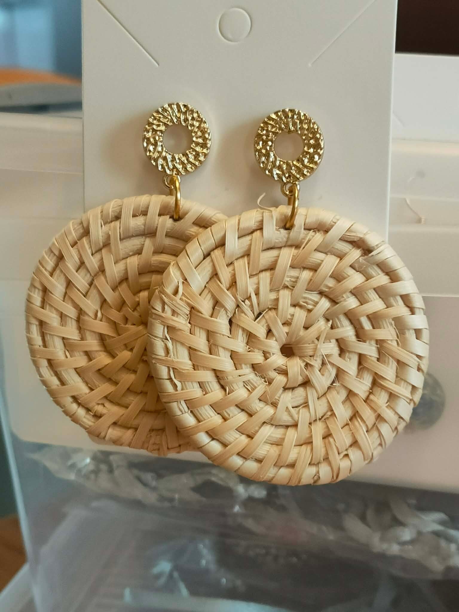 Breng natuurlijke elegantie en verfijnde zomerse allure samen met deze handgevlochten rotan oorbellen. Het ronde design in licht, naturel rotan wordt prachtig geaccentueerd door een subtiele goudkleurige hanger met verfijnde textuur, wat zorgt voor een luxueuze en stijlvolle uitstraling.