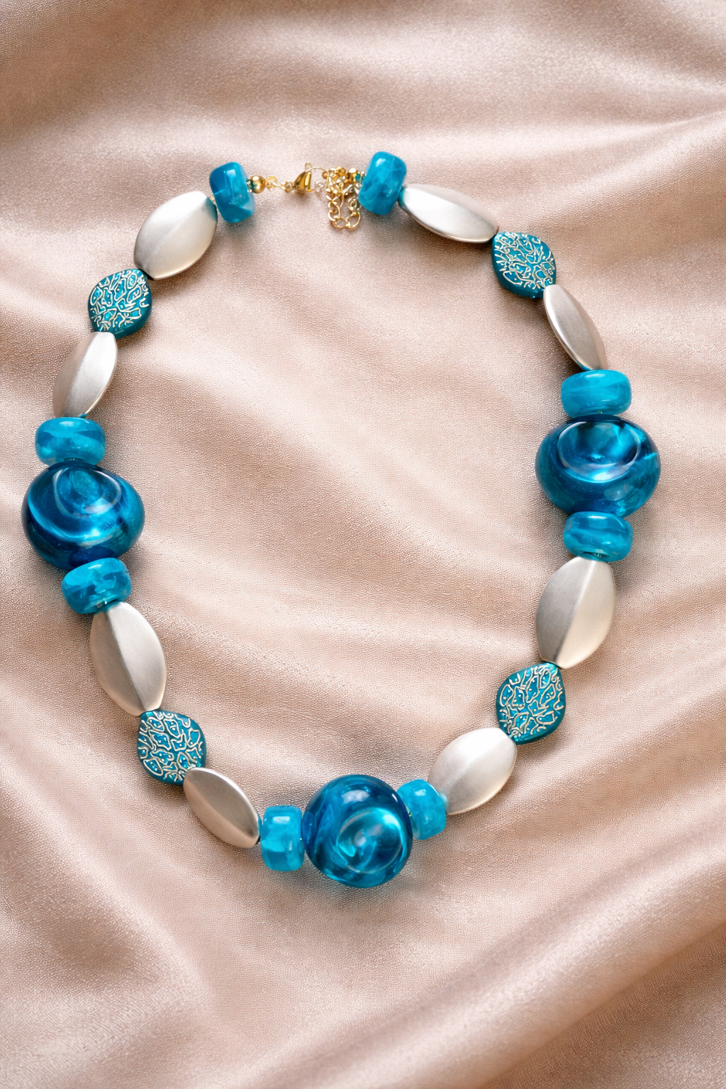 Breng een vleugje frisse elegantie in je outfit met de Ocean Glow Statement Ketting. Deze unieke ketting combineert diepe turquoise tinten met zachte parelmoer accenten, waardoor een stijlvolle en verfijnde uitstraling ontstaat.