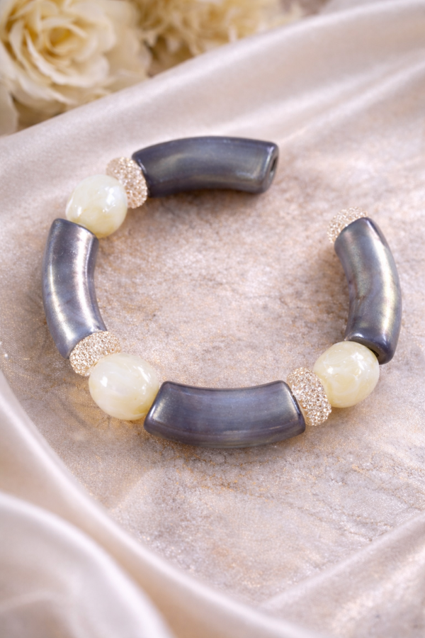 De armband is samengesteld uit ronde natuurstenen kralen in een warme, crèmekleurige tint en stijlvolle, gebogen kralen met een zachte blauwgrijze gloed. De sprankelende kristalaccenten zorgen voor een subtiel glamour-effect zonder te overheersen.