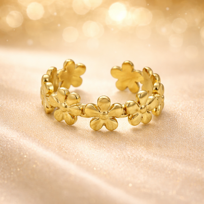 De Daisy Charm Ring is een speelse en vrouwelijke eyecatcher. Het open design is versierd met meerdere gedetailleerde madeliefjes die samen een frisse, romantische uitstraling creëren.
